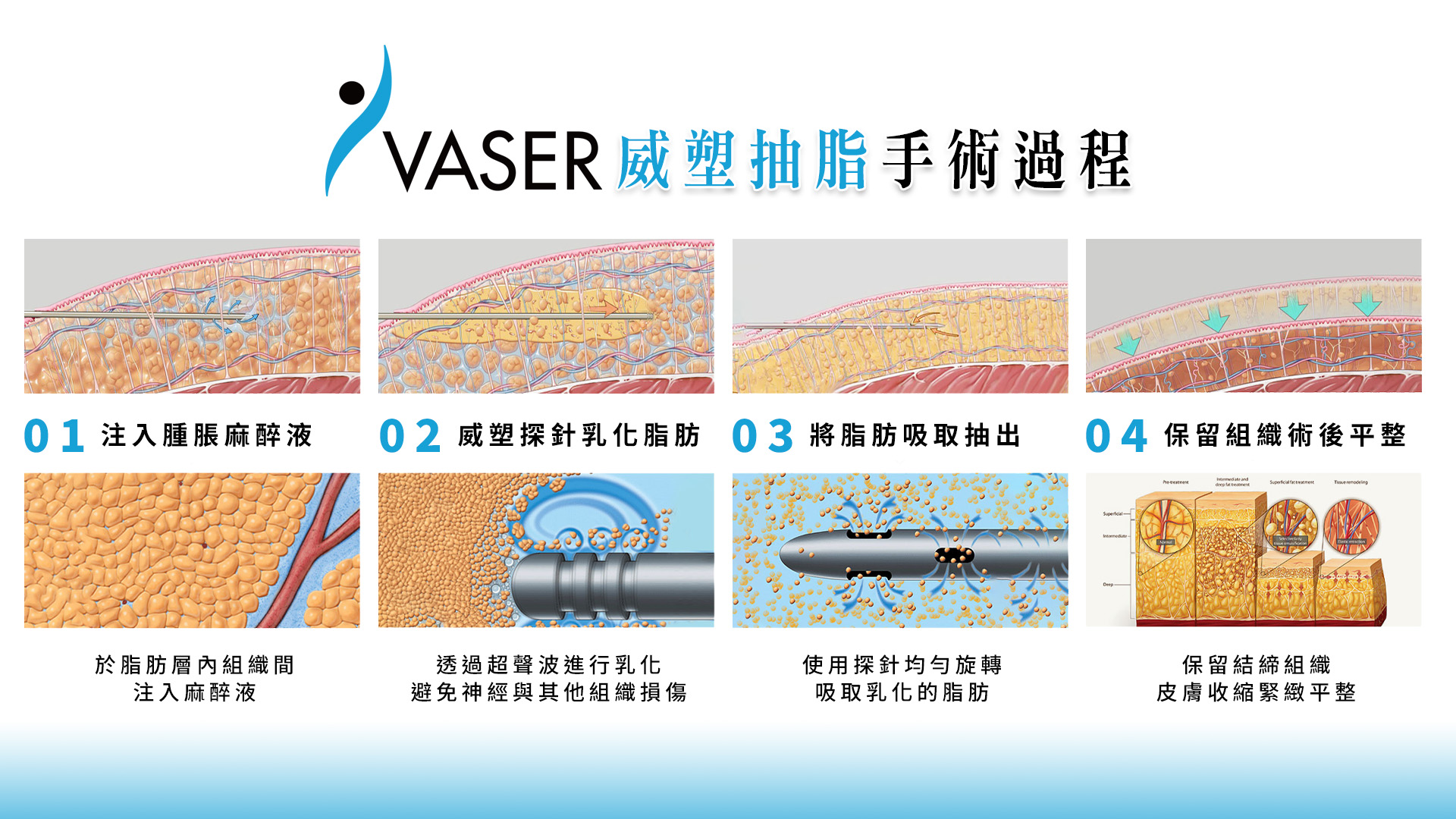 二代 VASER® 威塑 2.2 為目前市面上具備高度「脂肪選擇性」的先進抽脂技術。可同時處理深層脂肪移除與淺層線條雕塑,達到「深抽脂、淺精雕」的體雕效果,使身體曲線更緊實、比例更立體。