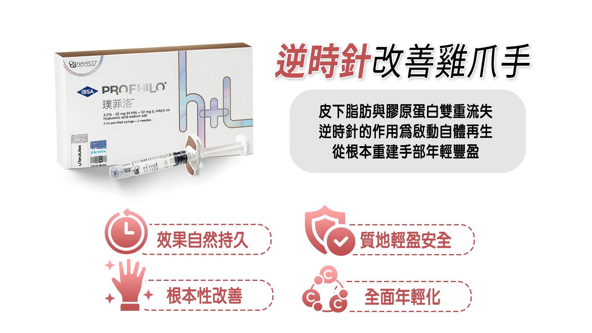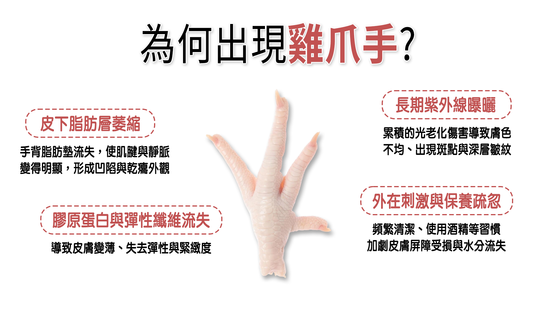 「雞爪手」的成因主要為皮下脂肪與膠原蛋白的雙重流失,導致手背皮膚變薄、血管與肌腱顯現。傳統填充僅是「補充體積」,而逆時針(聚雙旋乳酸,PDLLA)的作用機制則是「啟動自體再生」,從根本重建手部的年輕豐盈。