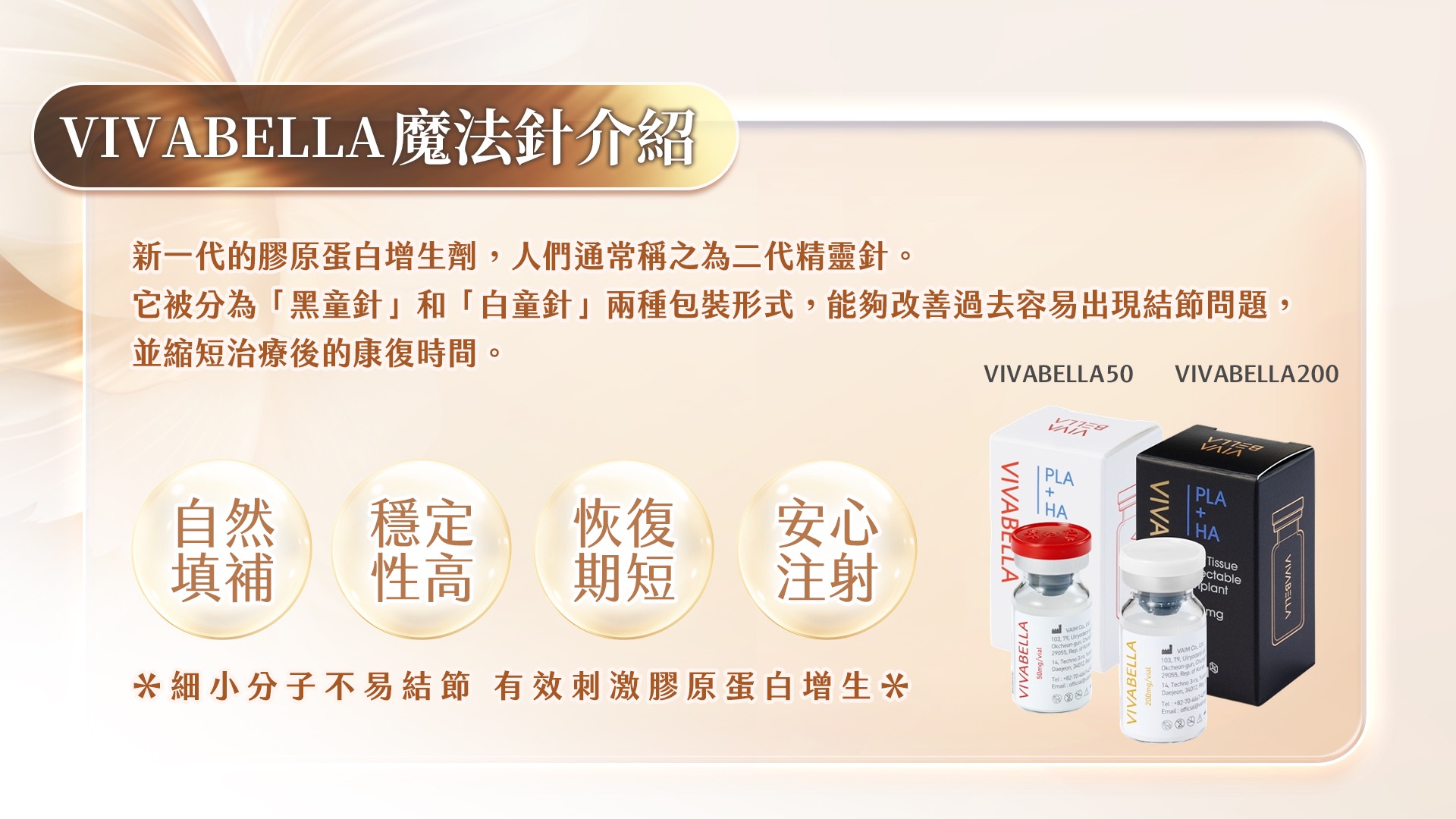「薇貝拉軟組織植入劑」是新一代的膠原蛋白增生劑,人們通常稱之為二代精靈針。它被分為「黑童針」和「白童針」兩種包裝形式,薇貝拉 VIVABELLA結合了聚雙旋乳酸PDLLA和玻尿酸的優勢,形成了一種多效聚雙旋乳酸,能夠改善過去容易出現結節問題,並縮短治療後的康復時間。
