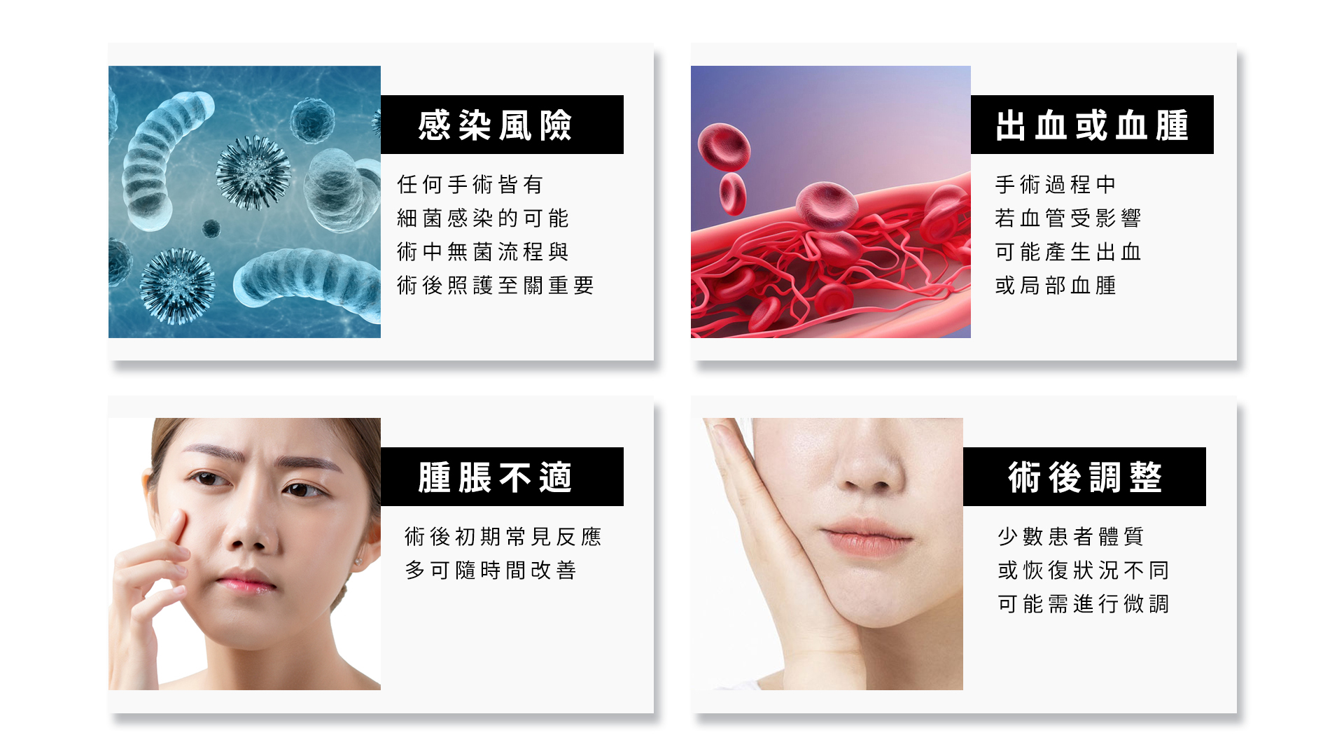 感染風險:任何手術皆有細菌感染的可能,術中無菌流程與術後照護至關重要