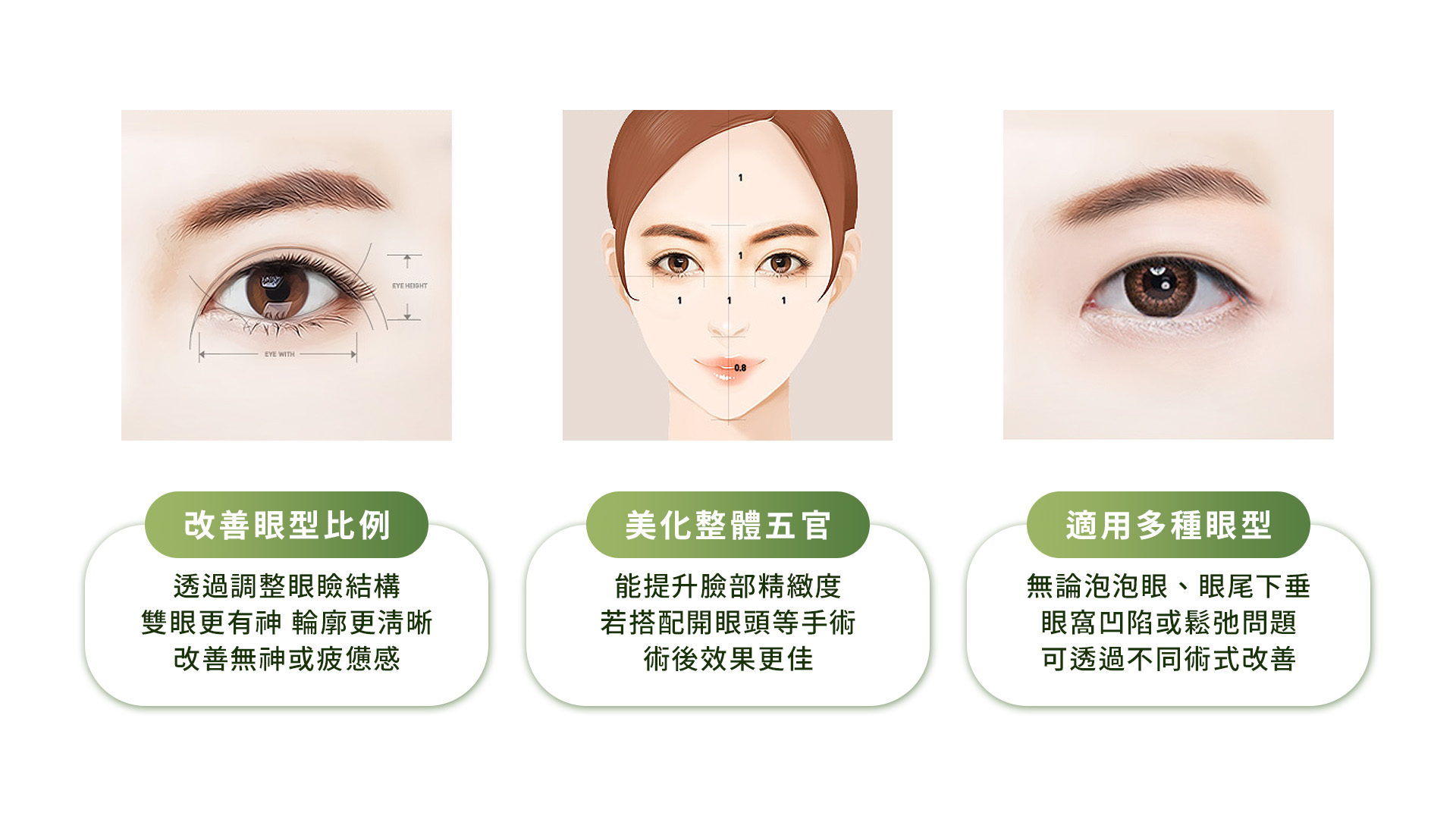 無論泡泡眼、眼尾下垂、眼窩凹陷或鬆弛問題,都可透過不同術式改善。